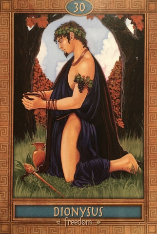 В детстве мы, начитавшись сказок, повторяли заклинание про плющ, привлекая удачу. Оказывается, плющ - это один из глифов Диониса, и я безмерно рада тому, что он вернулся в мою жизнь таким неожиданным образом. Ещё вкусными для меня глифами оказались кубок, тирс и различные музыкальные инструменты - тимпан, авлос, кимвалы, структурирующие и усиливающие поток.